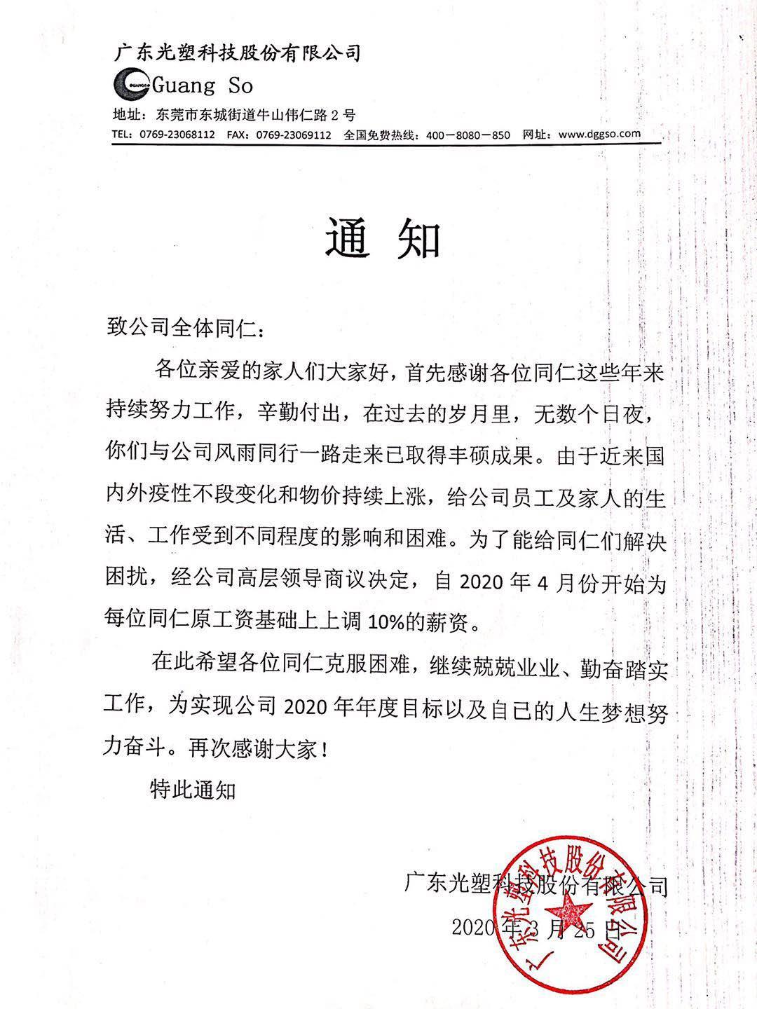 文章标题:点赞-光塑公司为员工逆市加薪